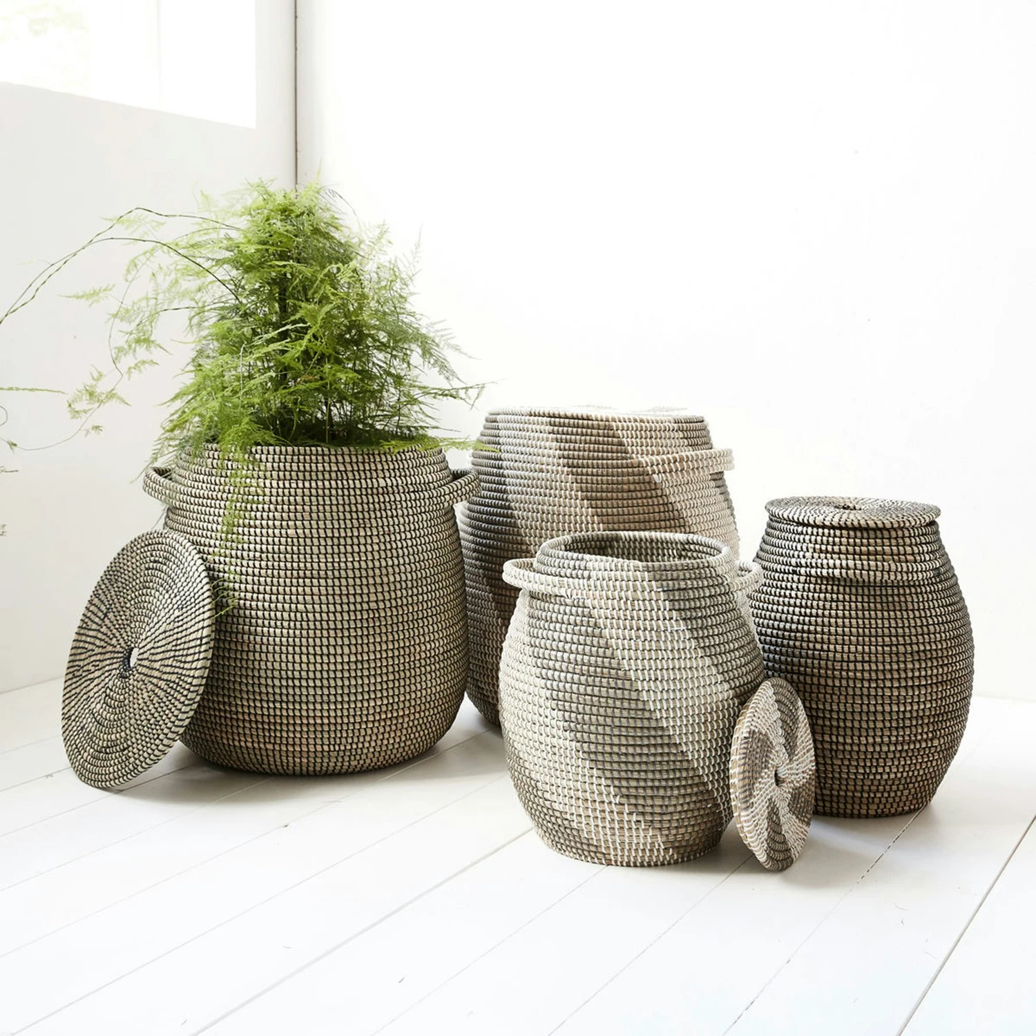 Effekt Körbe von House Doctor werden in zwei verschiedenen Größen geliefert. Die Körbe passen sehr gut nebeneinander, können aber auch in verschiedenen Räumen aufgestellt werden. Sie haben eine harmonische und angenehme natürliche Farbe mit schwarzen Mustern. Die Körbe eignen sich hervorragend für die Aufbewahrung von Decken bis hin zu Geräten. Wenn du besonders kreativ sein möchtest, kannst du die Körbe für eine schöne Pflanze verwenden. Denken jedoch daran, die Pflanze nicht zu gießen, wenn sie sich im Korb befindet.