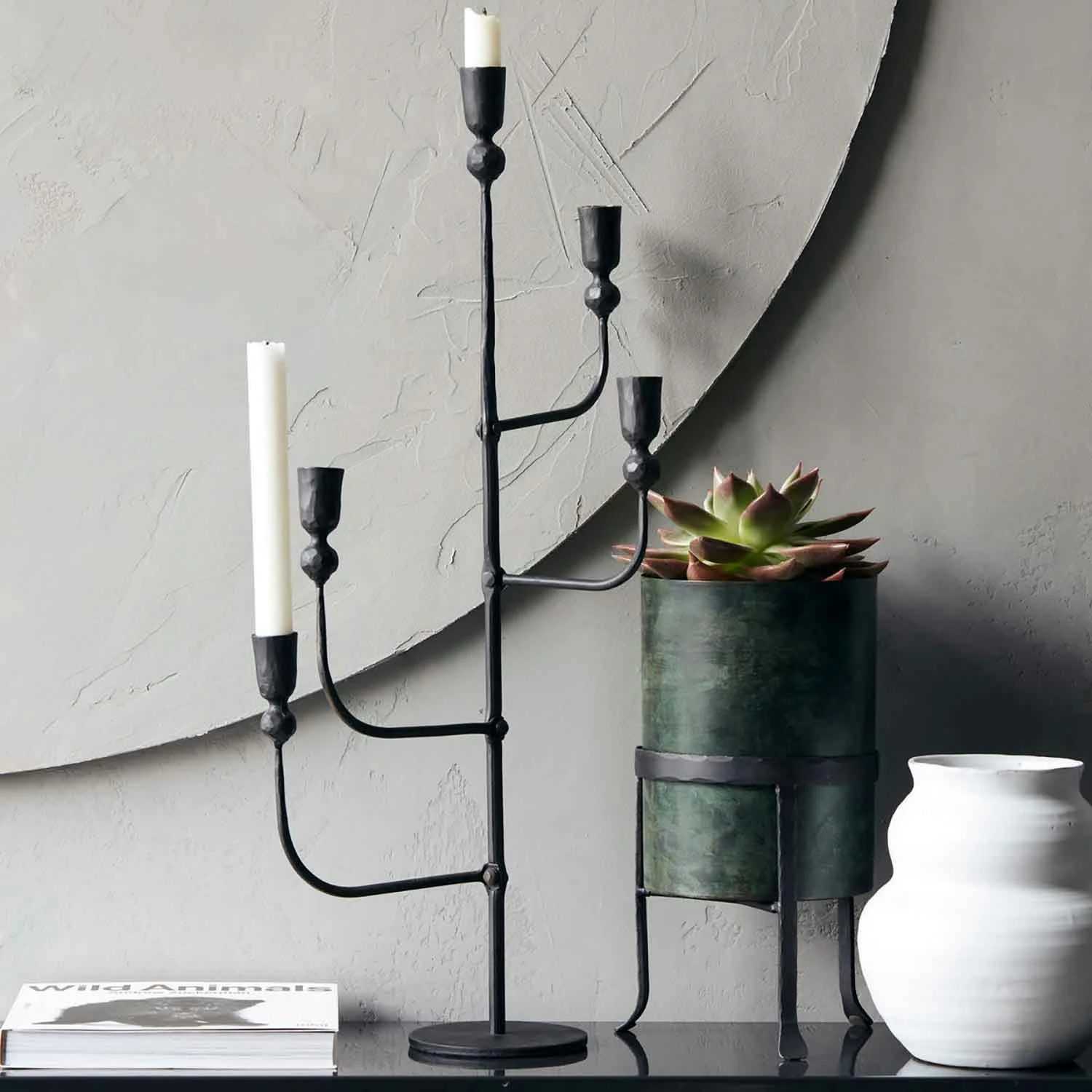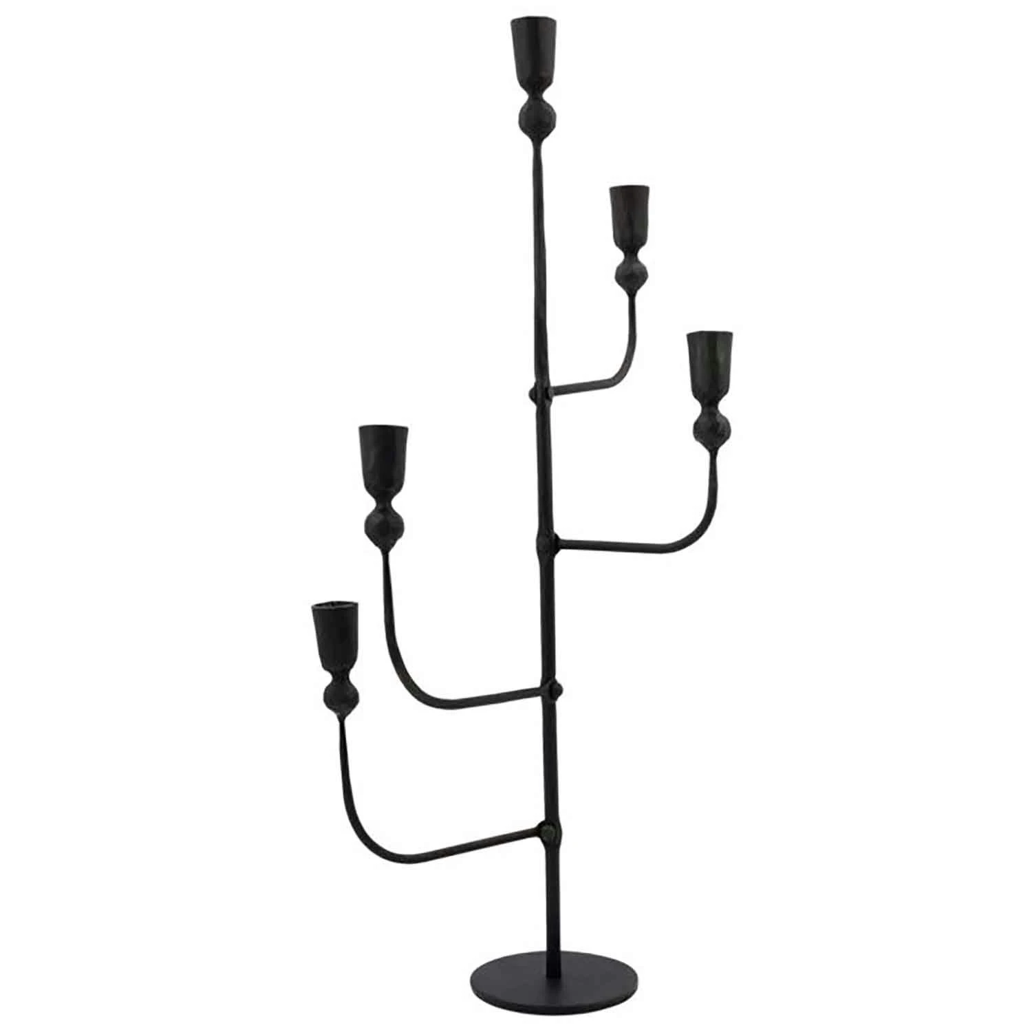 Der Kerzenhalter von House Doctor hat ein handgefertigtes Design aus schwarzem Eisen mit einem rauen, industriellen Look. Er hat fünf Lichthalter für weiches und diffuses Licht. Durch das handgefertigte Design können kleinere Variationen auftreten.
