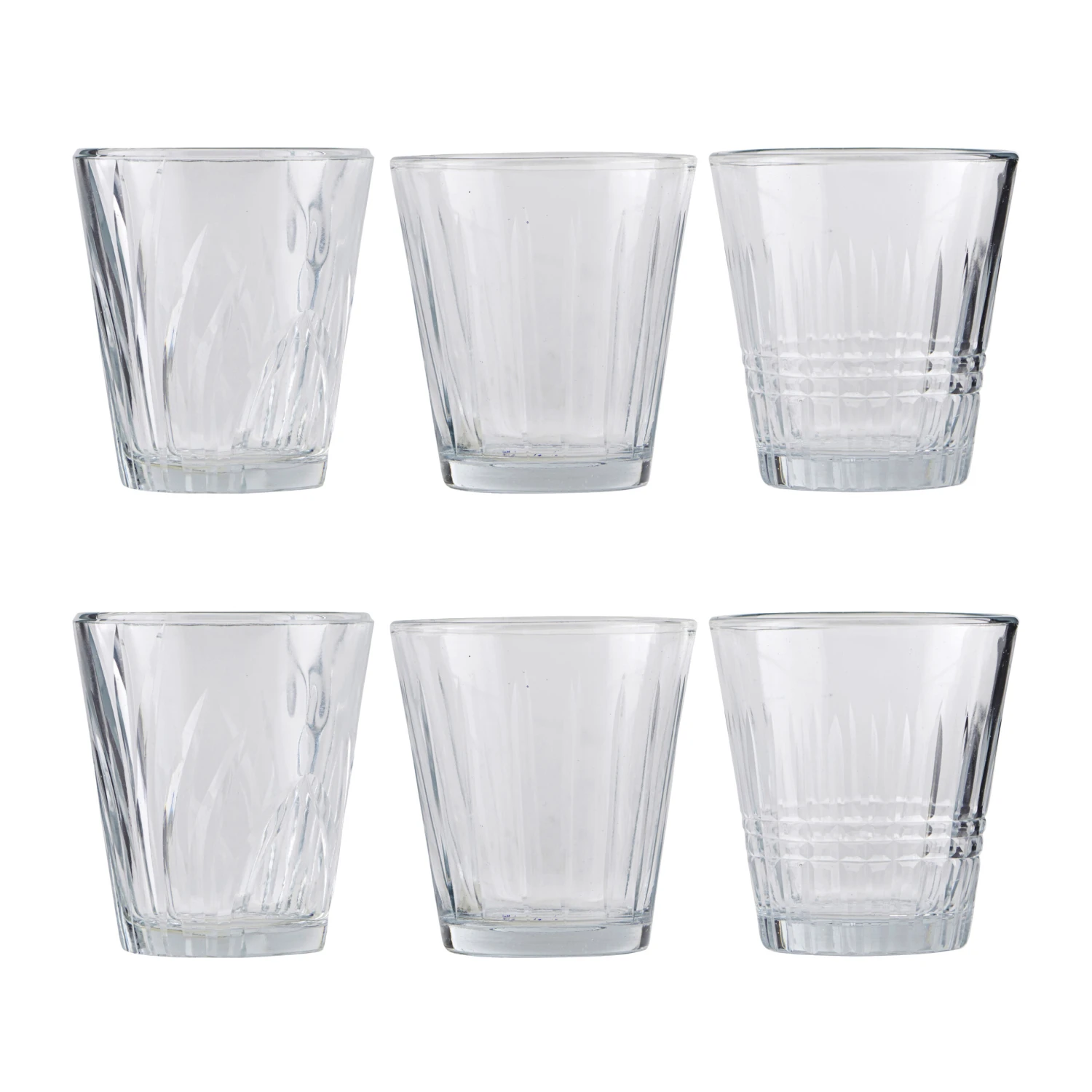 Mit dem Vintage Wasserglas 6er Pack fügen Sie Ihrem Zuhause auf unkomplizierte Weise einen hübschen Satz Trinkgläser im schicken Vintage-Stil hinzu. Die Verpackung beinhaltet sechs Gläser in drei verschiedenen Muster-Kombinationen, sodass Sie jeweils zwei Gläser mit gleichem Dekor erhalten. Jedes Glas verfügt damit über einen eignen Look und ein einzigartiges Muster, gleichzeitig sind alle Gläser in der gleichen Größe und Form gehalten. So können Sie ohne großen Aufwand eine variierte und ganz persönliche Tischdekoration erschaffen, ohne dabei nach Vintage-Gläsern mit verschiedenen Mustern oder Verzierungen suchen zu müssen.